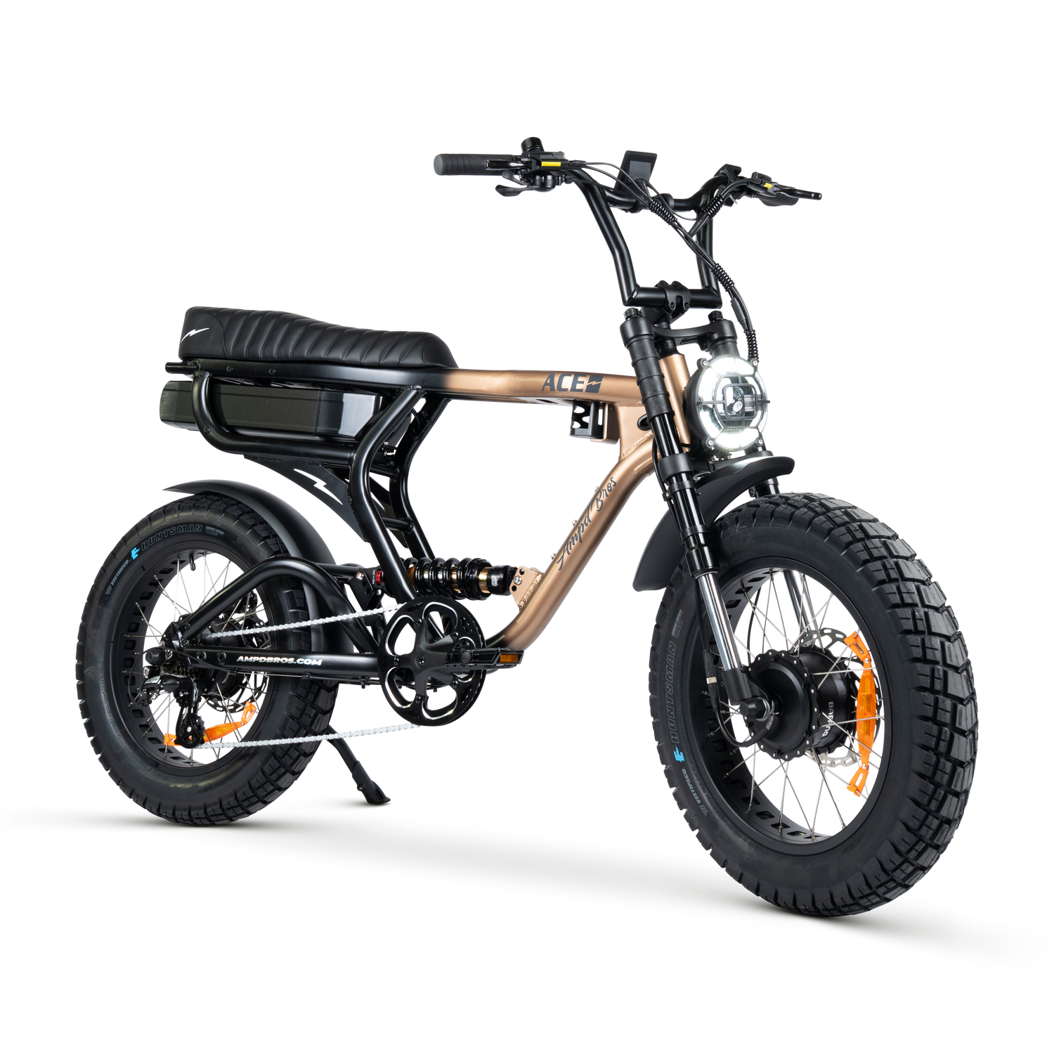 Engineered for both comfort and control, the ACE Demon features a dual suspension system that absorbs shocks from rough terrain, ensuring a smooth and enjoyable ride. The redesigned suspension offers 100mm of seat height adjustment, and the plush quilted seat provides extra comfort for long journeys. Whether you’re cruising on pavement or going off-road, the bike’s all-terrain Huntsman puncture-resistant tires keep you riding confidently.