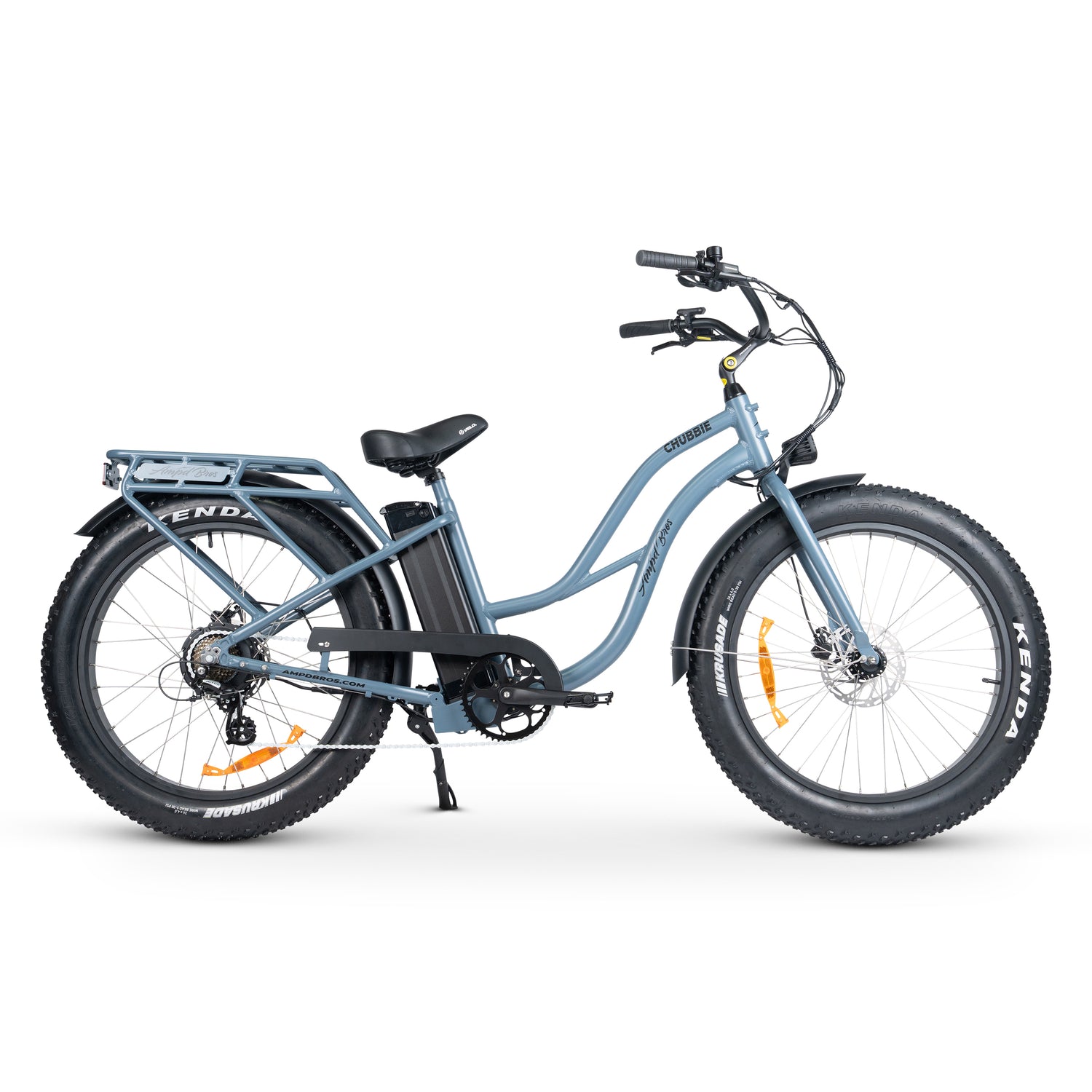 The Chubbie’s 26 × 4.0 inch Kenda Krusade fat mud tyres dominate all surfaces—from soft sand to dirt trails to urban pavement. A durable aluminium frame resists corrosion for year-round use, while front and rear Tektro hydraulic disc brakes with 180 mm rotors provide confident stopping power. The Shimano 7-speed transmission and KMC Z-Series rust-resistant chain ensure crisp, low-maintenance shifting ride after ride.