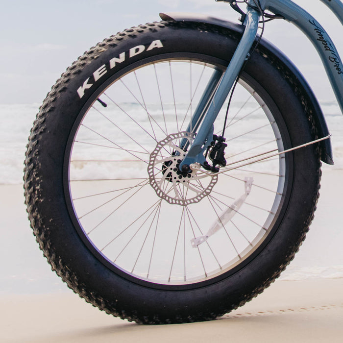 The Chubbie’s 26 × 4.0 inch Kenda Krusade fat mud tyres dominate all surfaces—from soft sand to dirt trails to urban pavement. A durable aluminium frame resists corrosion for year-round use, while front and rear Tektro hydraulic disc brakes with 180 mm rotors provide confident stopping power. The Shimano 7-speed transmission and KMC Z-Series rust-resistant chain ensure crisp, low-maintenance shifting ride after ride.